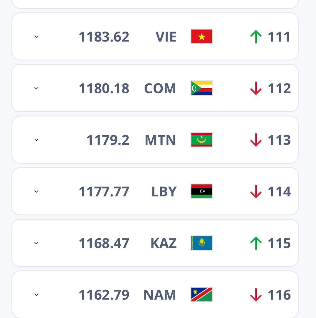 وكشف التصنيف الصادر الجمعة، وجود المنتخب في الرتبة 16 عربيا متقدما على دول ليبيا والسودان والكويت واليمن وجيبوتي والصومال.