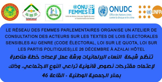 أطلقت شبكة النساء البرلمانيات الموريتانيات (REFPAM)، بالتعاون مع الجمعية الوطنية، وهيئة الأمم المتحدة للمرأة، وشركاء آخرين، اليوم ورشة عمل متخصصة بمقر الجمعية الوطنية، مخصصة لإعداد خطة مناصرة تشريعية تراعي النوع الاجتماعي.