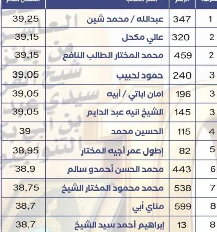 وحصل على المركز التاسع عمر عبد الله آيه بـ38.55، فيما حلّ لمرابط سيد أبوه في المرتبة العاشرة بعد حصوله على معدل 38.45.