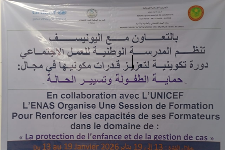 Ainsi, l'évènement qui a été supervisé par le directeur de l’école, Pr. Mohamed Lemine Ould El Hassen, dans le cadre d'un protocole d’accord signé avec l’UNICEF, a été marqué par un mot d'ouverture dans lequel il a souligné que la présente formation qui dure une semaine, se doit de s’assurer, de l’implication de tous les participants dans une approche participative, active, constructive et appropriative, les débats et échanges devant s'articuler autour des concepts en action social et en enfance pour garantir une même compréhension de toute la terminologie relative au domaine de l'action sociale et au code la famille.