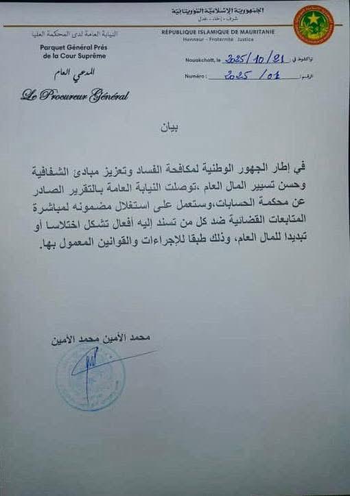 وأضاف ولد محمد الأمين في بيان مقتضب أصدره في وقت متأخر من ليل الأربعاء أن هذه المتابعات ستكون ضد كل تسند إليها أفعال تشكل اختلاسا أو تبديدا للمال العام.