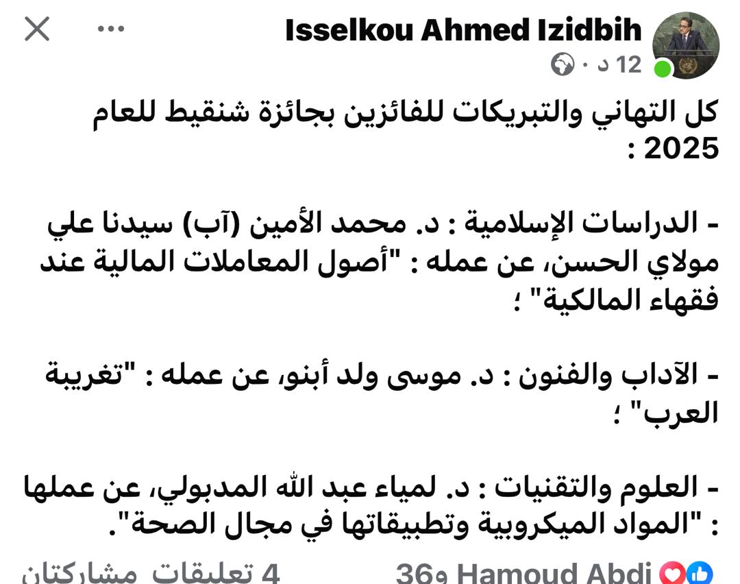 أعلن رئيس مجلس جائزة شنقيط الدكتور إسلك أحمد إيزيدبيه اليوم الأربعاء عن أسماء الفائزين بالجائزة للعام 2025.